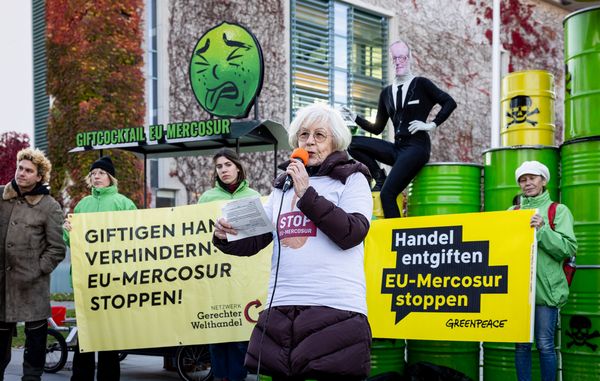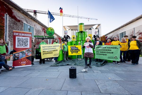 Protestaktion gegen Freihandelsabkommen EU-Mercosur Freiburg Augustinerplatz am Samstag, 15.11.25 , 10.00 bis 12.30