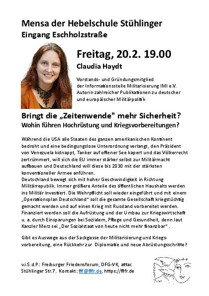 Vortrag von Claudia Haydt am 20.02.2026. Beginn der Veranstaltung ist um 19.00, sie findet in der Mensa der Hebelschule statt.