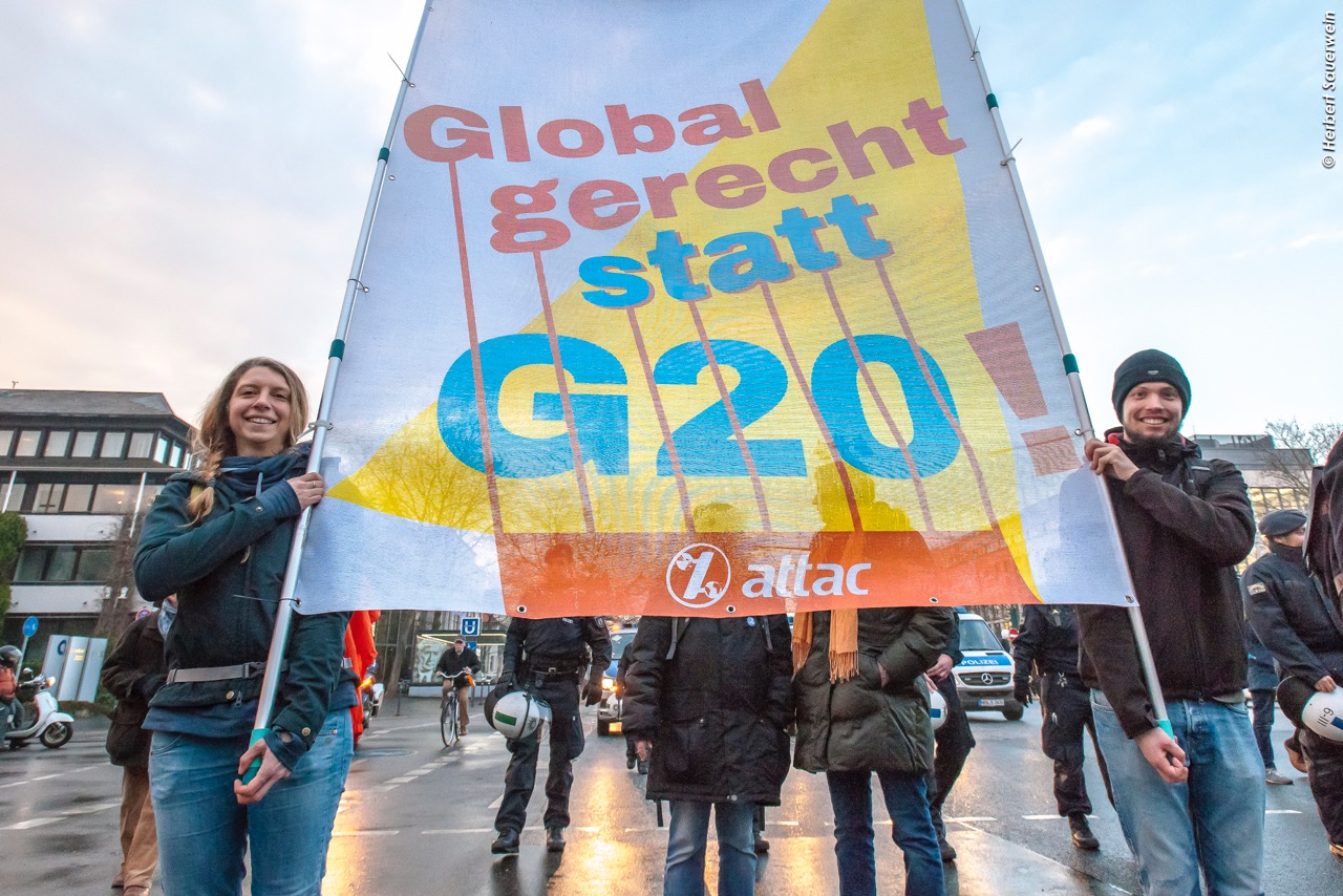 Kein G20-Treffen ohne Protest - auch nicht in der ehemaligen Bundeshauptstadt Bonn. Attac-Aktivist_innen aus Bonn, Köln, Rhein-Sieg und Aachen waren dabei, trotz Regen und übernervöser Polizei. Merke: Rosa Rauch ist noch keine "Ausschreitung". Aber 'ne große Weltkugel sieht immer gut aus! Haben wir doch gerne mitgebracht.