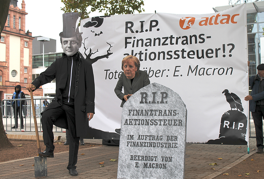 Bei der Eröffnung der Frankfurter Buchmesse durch Emmanuel Macron und Angela Merkel haben Aktivist_innen von Attac gestern Abend vor einer düsteren Friedhofskulisse auf die drohende Beerdigung der Finanztransaktionssteuer hingewiesen. Damit machte Attac auf die Steuerpläne Macrons aufmerksam, die einem Geschenk an die Finanzindustrie gleich kommen.