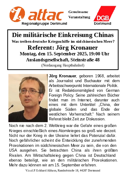 15. September: Jörg Kronauer: „Die militärische Einkreisung Chinas. Was treiben deutsche Kriegsschiffe im südchinesischen Meer?“