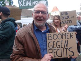 Demonstrant zeigt ein Plakat: "Boomer gegen rechts"