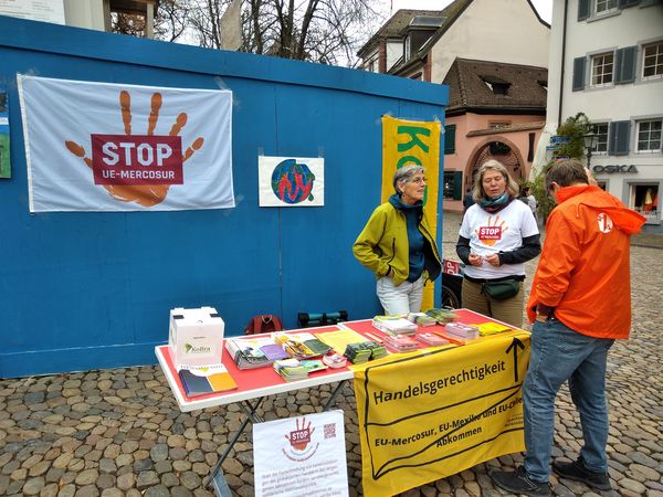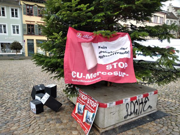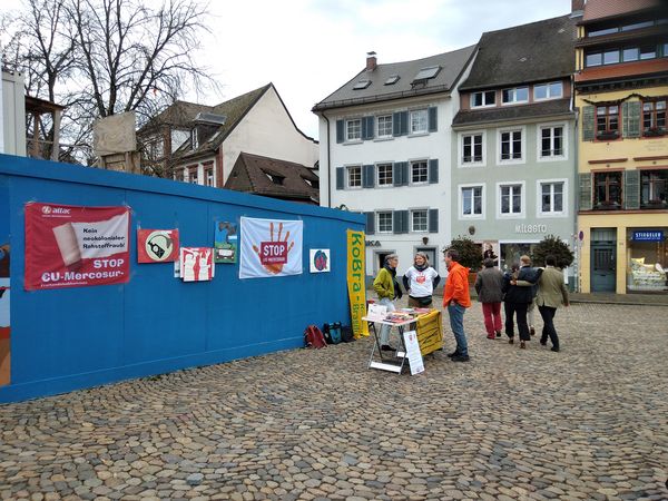 Attac Freiburg zusammen mit Infostelle Peru und Kooperation Brasilien, wir wollen aufmerksam machen auf die negativen Auswirkungen des Abkommens.