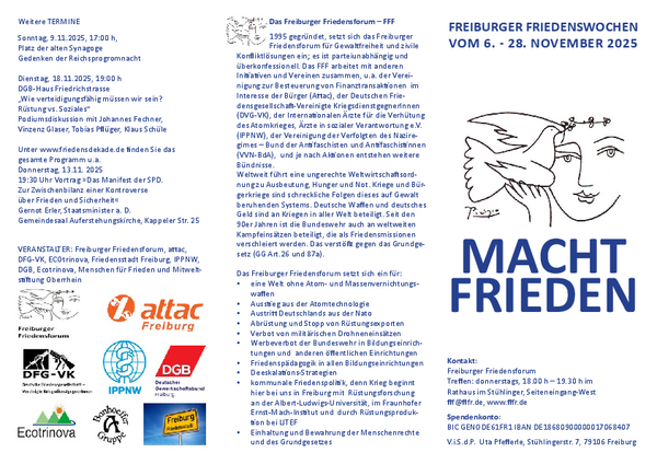 Friedenswochen 06.11.-28.11.2025Sie finden das Programm des Friedensforums wenn sie den Link in der o.Überschrift anklicken.