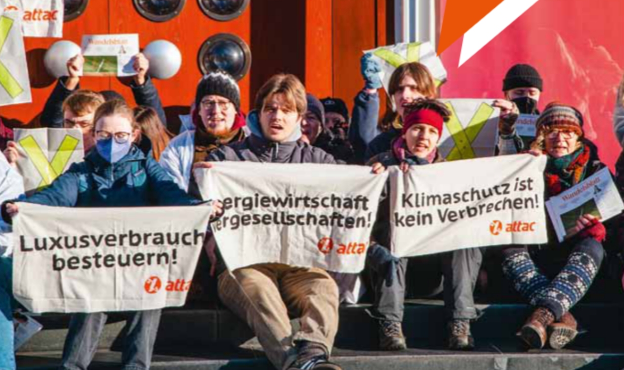 Um diese Wende sozial zu gestalten, gibt es einiges im Attac-Werkzeugkasten. Zum einen engagiert sich Attac für ein gerechtes Steuersystem: Die Kosten von Krisen und für den Klimaschutz müssen vor allem diejenigen tragen, die es sich leisten können, die von Krisen profitieren oder maßgeblichen Anteil an der Klimakatastrophe tragen. Schließlich ist das reichste Prozent der Menscheit allein für 15 Prozent der CO2-Emissionen verantwortlich, die ärmeren 50 Prozent dagegen nur für sieben Prozent. Höchste Zeit, dass Luxusverbrauch hart besteuert wird!