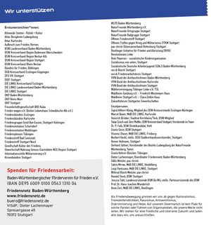 2. Oktober 16:30 - Mahnwachen für Frieden und Abrüstung Bietigheim Kronenplatz, am ersten Donnerstag eines Monats 16:30 bis 18:30