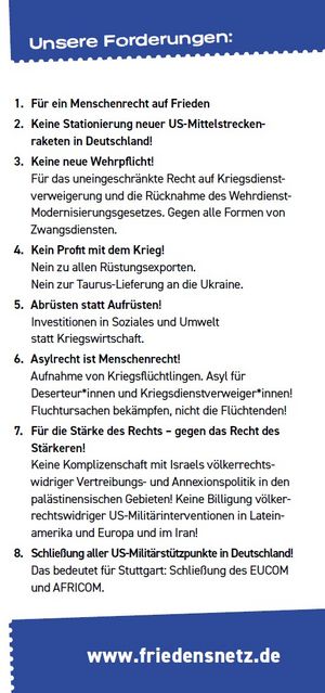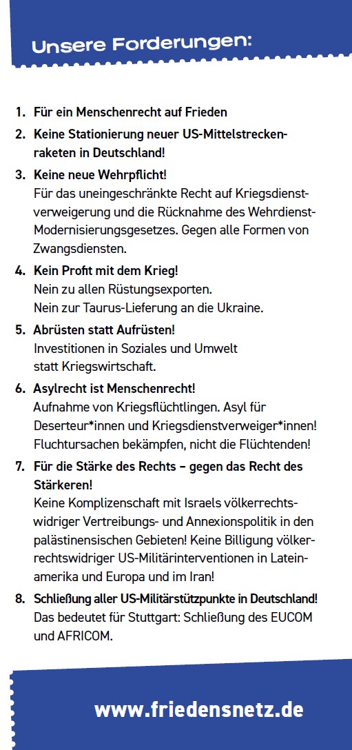 Die Organisatoren fordern u.a. einen Stopp des Hochrüstungskurses, einen Verzicht auf die Stationierung von US-Mittelstreckenwaffen in Deutschland und mehr diplomatisches Engagement zur Beendigung der Kriege in Europa und dem Nahen und Mittleren Osten. Hauptrednerin auf der Kundgebung wird Margot Käßmann sein.