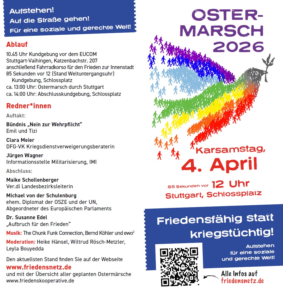 Am Karsamstag, den 04. April, findet ab 12 Uhr der diesjährige Ostermarsch auf dem Stuttgarter Schlossplatz statt. Unsere Attac-Regionalgruppe Besigheim-Ludwigsburg unterstützt diesen Protest auch in diesem Jahr. Anlässe gibt es ja leider mehr als genug. Wir rufen Euch alle zur Teilnahme auf. Wer möchte, kann gerne gemeinsam mit uns anreisen. Abfahrt in Besigheim wäre um 11.17 Uhr, so dass wir, so denn alles planmäßig verläuft, um 11.44 Uhr in Stuttgart sind. Alle weiteren Infos könnt ihr dem Flyer entnehmen.