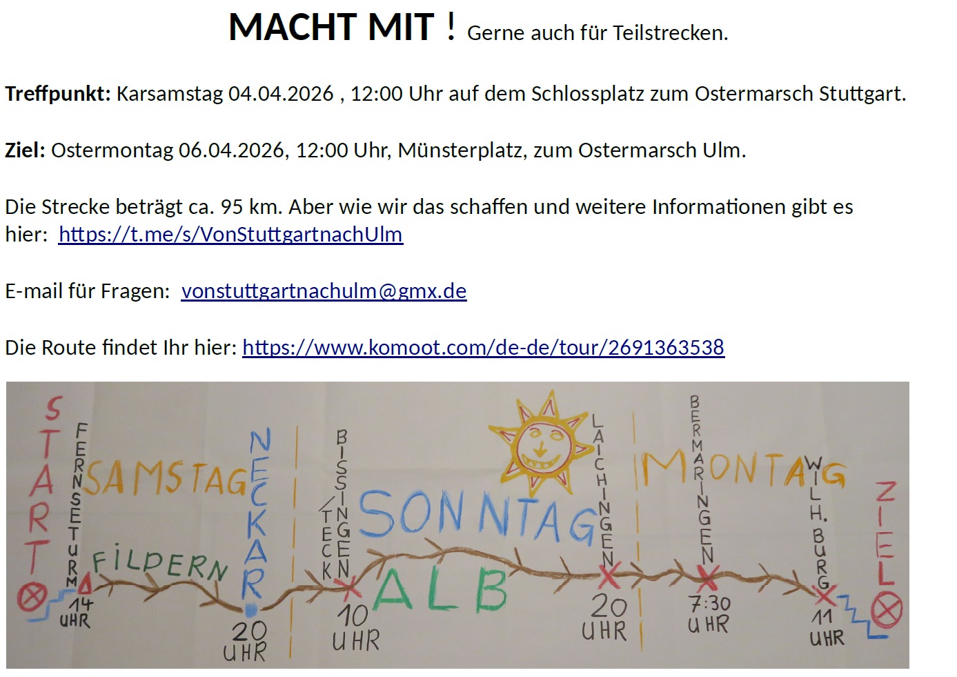 Ein guter Einstiegspunkt nach dem Ostermarsch wäre 16:30 ab Scharnhausen nach Wendlingen 20:00. Ca 12km. Zum Bahnhof Wendlingen weitere 2 km. (Siehe Beschreibung Samstag und Wegpunkte)
