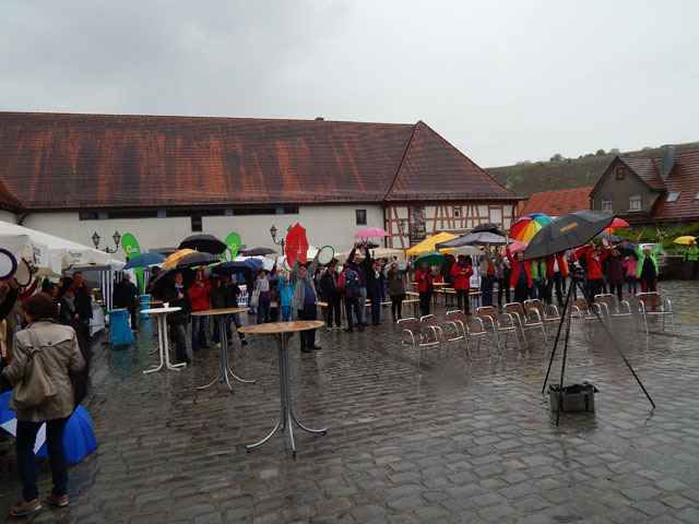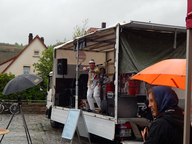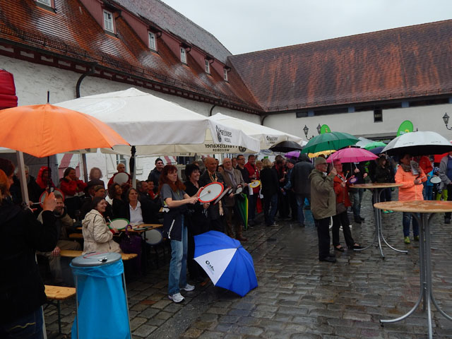 Obwohl für uns eine Premiere, lief das Open-Air ohne Hänger von 14 bis 18 Uhr. Dabei konnte der Regen der Stimmung nichts anhaben. Sicher wäre bei schönem Wetter der Kelterplatz ganz gefüllt gewesen, aber das vielfältige Programm unterhielt doch eine beachtliche Besucherschar: mit klassischer Musik vom "Quartetto con Flauto", Protest-Folk vom us-amerikanischen Liedermacher David Rovics, Mitmach-Rhythmen mit Till Ohlhausens CircleDrumming, einer satirischen Einlage des Besigheimer Regisseurs Rüdiger Erk von der Studio-Bühne. Die Leiterin und Regisseurin Edith Koerber vom Stuttgarter Theater "tri-bühne" sprach über die Gefährdung der Kultur durch TTIP. Jazz-Freunde kamen beim Regina-Büchner-Quartett mit Saxophon, Bass und Schlagzeug auf ihre Kosten. Für einen stimmungsvollen Abschluss sorgte "Der kleine Blechzirkus". Das Sextett mit dem Besigheimer Künstler Uli Gsell an der Tuba dürfte so manchem von den Protesten gegen Stuttgart 21 bekannt sein.