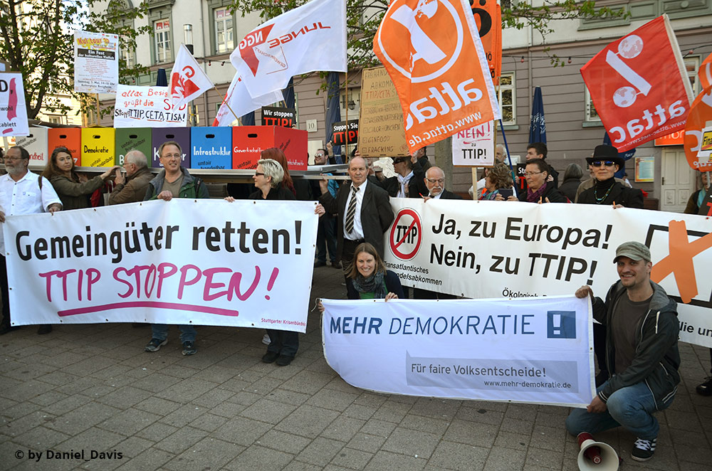 Begonnen hatte der Protestzug vor dem Gebäude der Landeswasserversorgung am Urbansplatz. Anschließend zogen die Demonstranten über insgesamt 7 Stationen zur SPD-Parteizentrale am Wilhelmsplatz. In den Reden an diesen Orten, die für Bereiche stehen, die durch das Freihandelsabkommen betroffen sind- wie zum Beispiel das Katharinenhospital oder die Volkshochschule am Rotebühlplatz- wurden die verheerenden Auswirkungen dieser geplanten Abkommen für diese Bereiche recht plastisch geschildert.