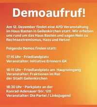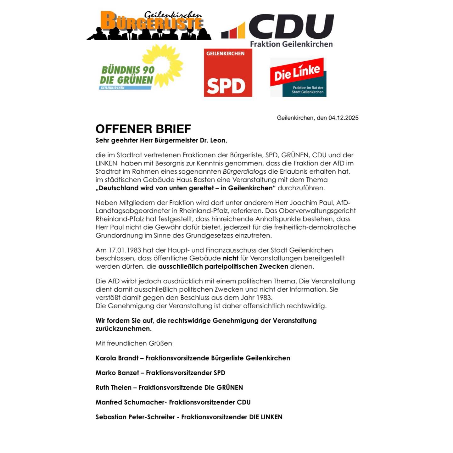Der Bürgermeister der Stadt Geilenkirchen Dr. Leon (CDU) hat den Saal im Haus Basten für eine Veranstaltung der AFD vergeben. Dagegen gibt es Protest aus der Bürgerschaft und von allen anderen Fraktionen des Rates. Den Aufruf des Bündisses mit den Terminen finden Sie hier. Den Aufruf der Fraktionen des Rates der Stadt Geilenkirchen finden Sie hier.